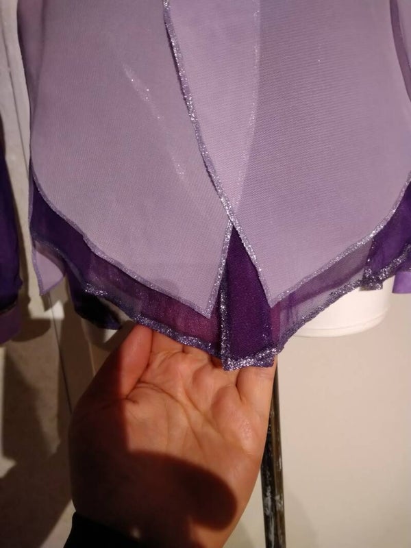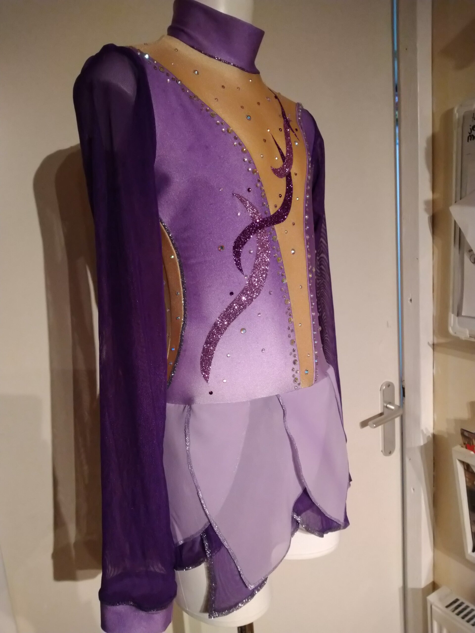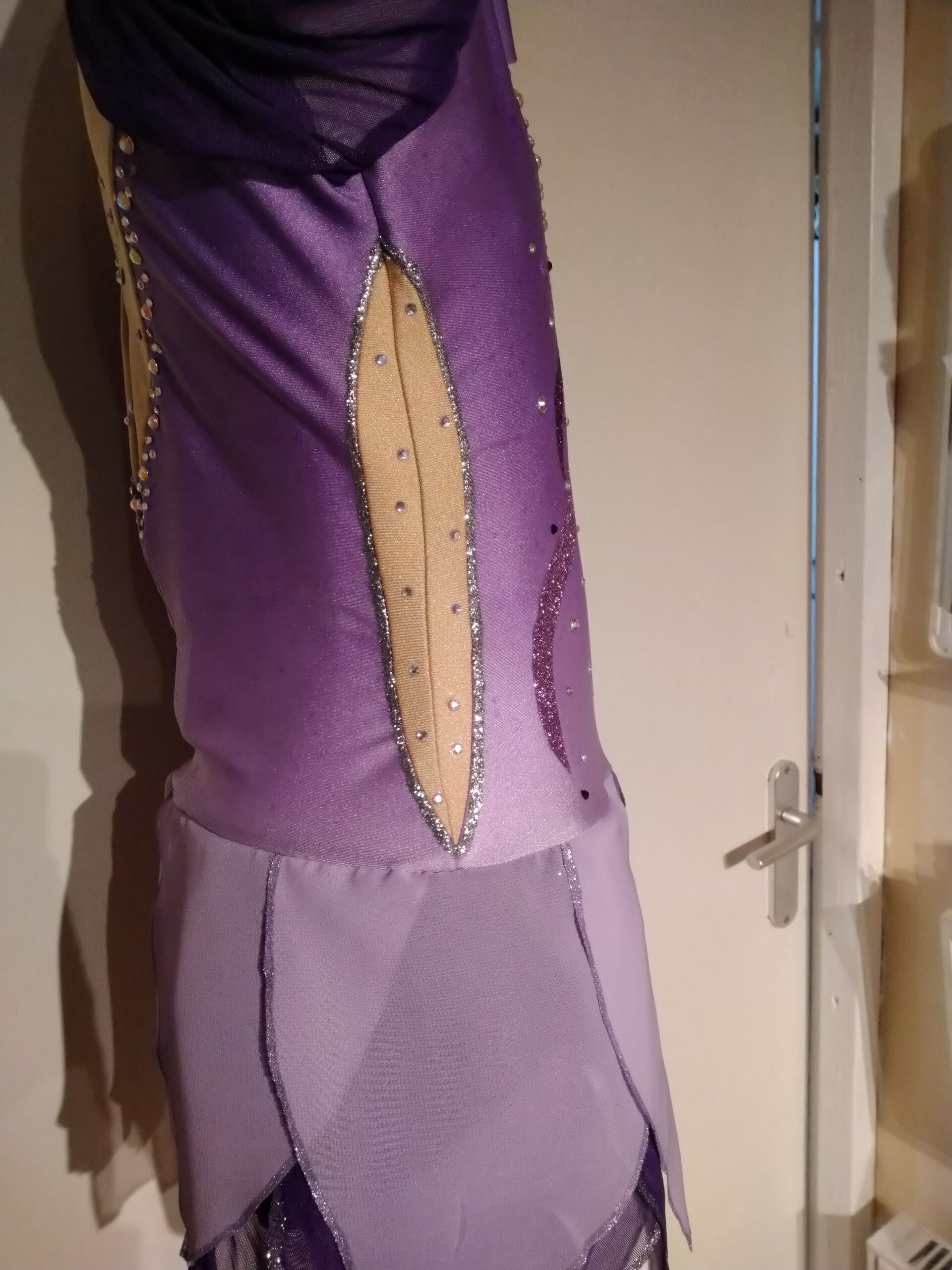 hand geschilderd lycra en stretch mess stof. Incl geschilderde details. veel strass strenen kristal en paars, incl grote kristal stenen. blinde rits.